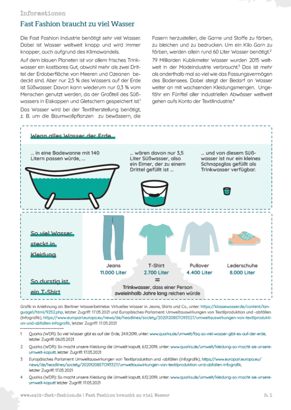 Die Fast Fashion Industrie benötigt sehr viel Wasser. Ein T-Shirt allein benötigt 2.700 Liter Wasser. Dabei ist Wasser weltweit knapp und wird immer knapper, auch aufgrund des Klimawandels. Mehr als anderthalbmal so viel wie das Fassungsvermögen des Bodensees benötigte die Textilindustrie im Jahr 2015. Und der Bedarf an Wasser steigt weiter an mit wachsenden Kleidungsmengen.…