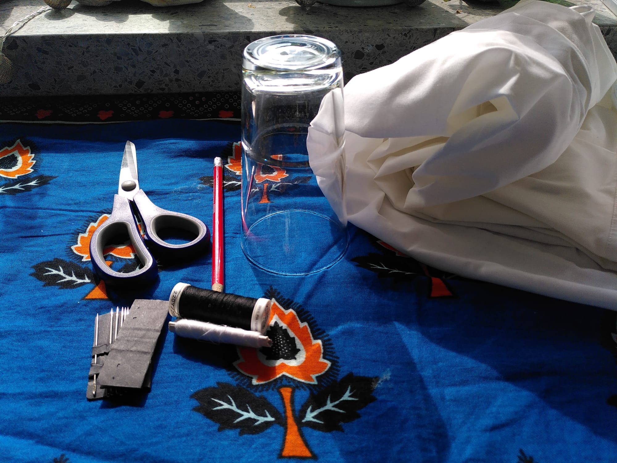 - Material: 1 Stoffschere, 1 Stift zum Vorzeichnen, 1 runde Schablone, z. B. Glas, Nadel & Faden, optional: Nähmaschine, Stoff, z. B. altes T-Shirt, alte Handtücher, Stoffreste